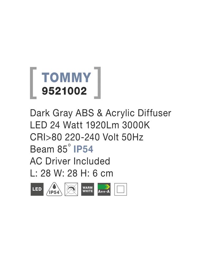 Срок на доставка: ПО ЗАПИТВАНЕ Продуктова информация Материал: Dark Gray ABS & Acrylic Diffuser, Ac Driver Included Тип крушка: LED 24 Watt 1920Lm 3000K, 220-240 Volt 50Hz Beam 85 degrees -IP54- Код: 9521002 Тип продукт: OUTDOOR – CEILING Размери: L: 28 W: 28 H: 6 cm