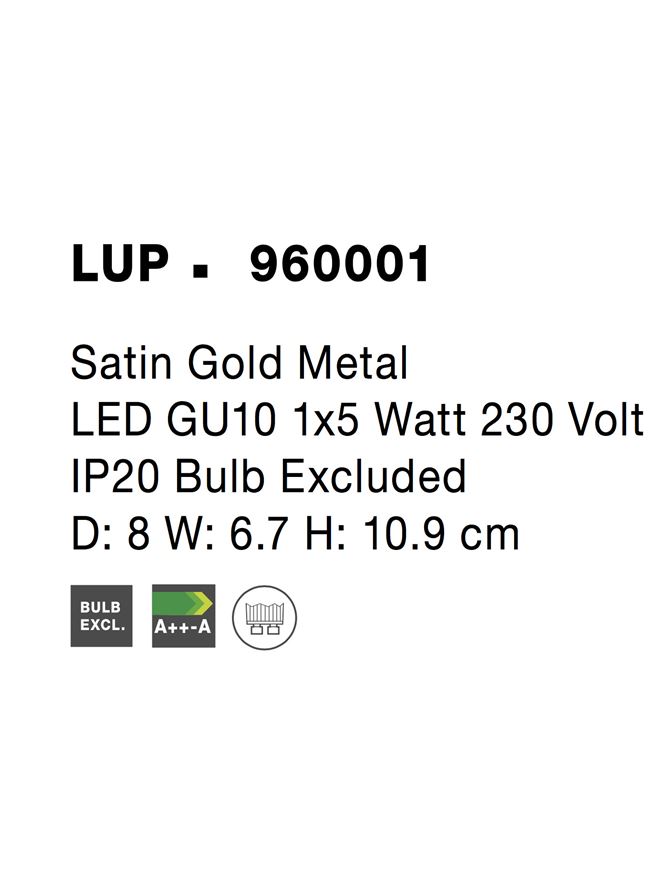 Срок на доставка: ПО ЗАПИТВАНЕ Продуктова информация Материал: Satin Gold Metal Тип крушка: LED GU10 1×5 Watt IP20 Bulb Excluded Код: 960001 Тип продукт: SPOT Размери: D: 8 W: 6.7 H: 10.9 cm