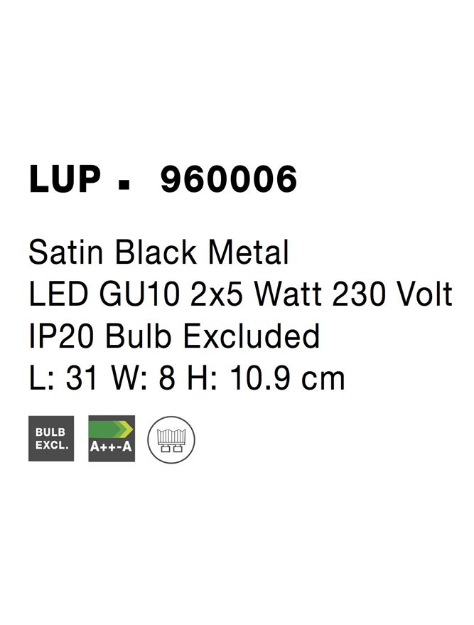 Срок на доставка: ПО ЗАПИТВАНЕ Продуктова информация Материал: Satin Black Metal Тип крушка: lED GU10 2x5W IP20 Bulb Excluded Код: 960006 Тип продукт: SPOT Размери: L: 31 W: 8 H: 10.9 cm
