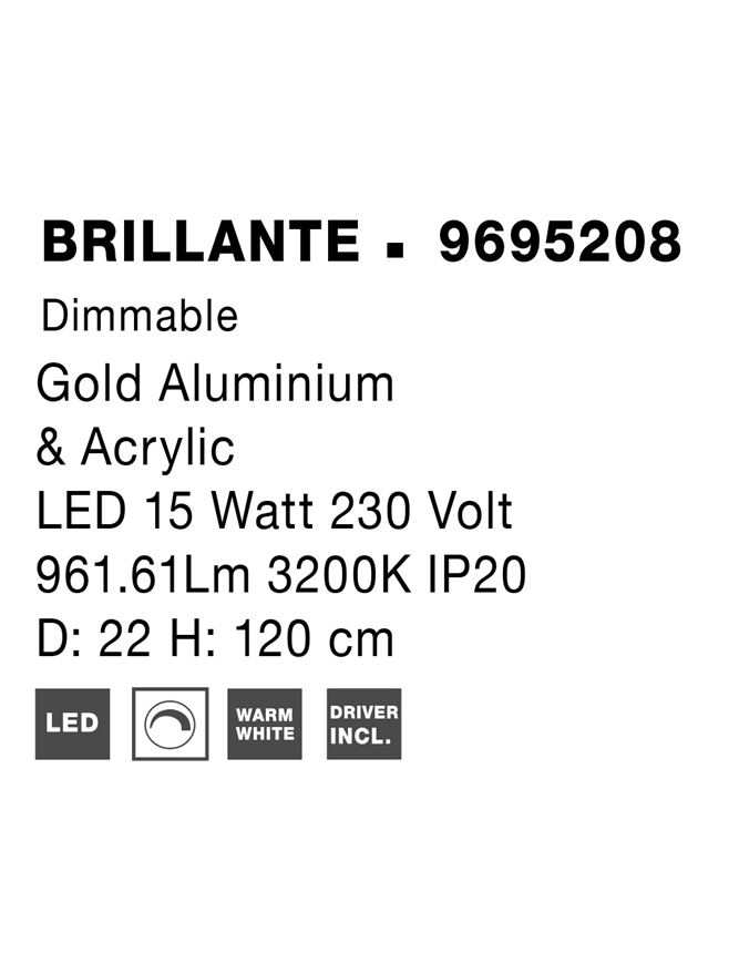 Gold Aluminium & Acrylic LED 15 Watt 230 Volt 664Lm 3200K IP20 D: 22 H: 120 cm