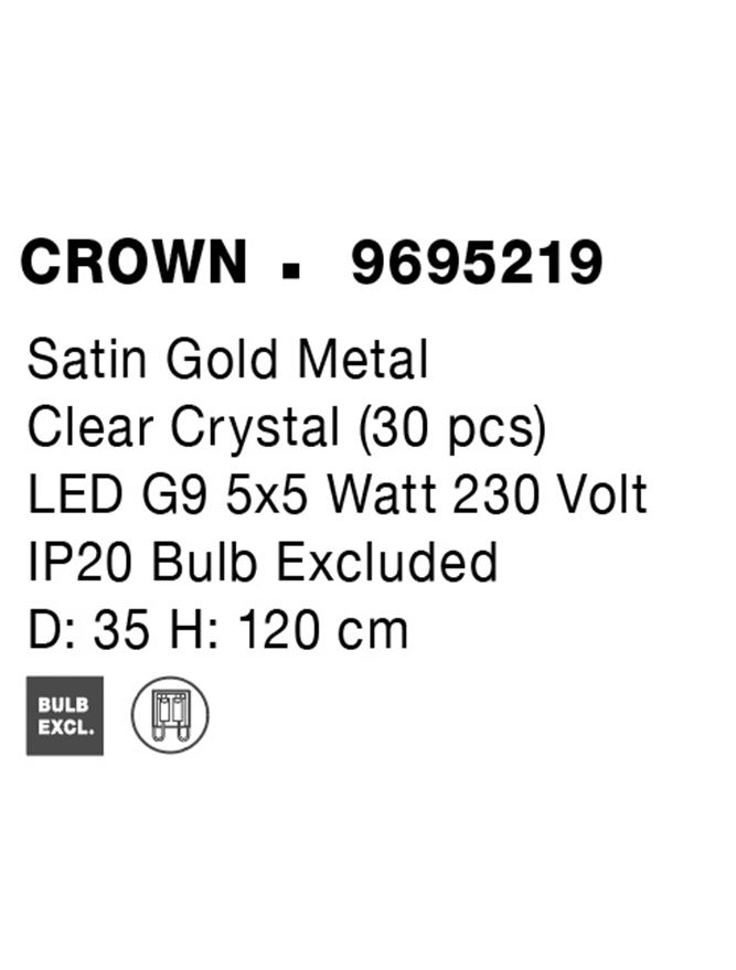 Срок на доставка: ПО ЗАПИТВАНЕ Продуктова информация Материал: Satin Gold Metal Clear Crystal (30 pcs) Тип крушка: LED G9 5×5 Watt 230 Volt IP20 Bulb Excluded Код: 9695219 Тип продукт: MODERN PENDANT LUMINAIRES Размери: D: 35 H: 120 cm