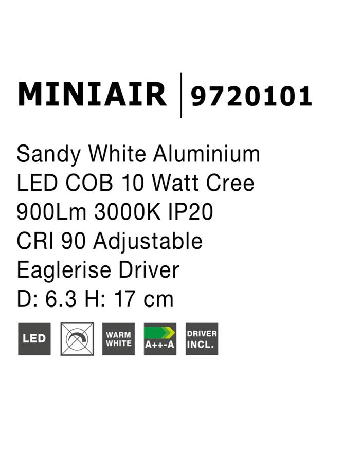 Срок на доставка: ПО ЗАПИТВАНЕ Продуктова информация Материал: Sandy White Aluminium, Rotating & Adjustable Тип крушка: LED COB 10 Watt Cree 900Lm 3000K IP20 CRI 90 Eaglerise Driver Код: 9720101 Тип продукт: GU10 AND LED SPOTS Размери: D: 6.3 H: 17 cm