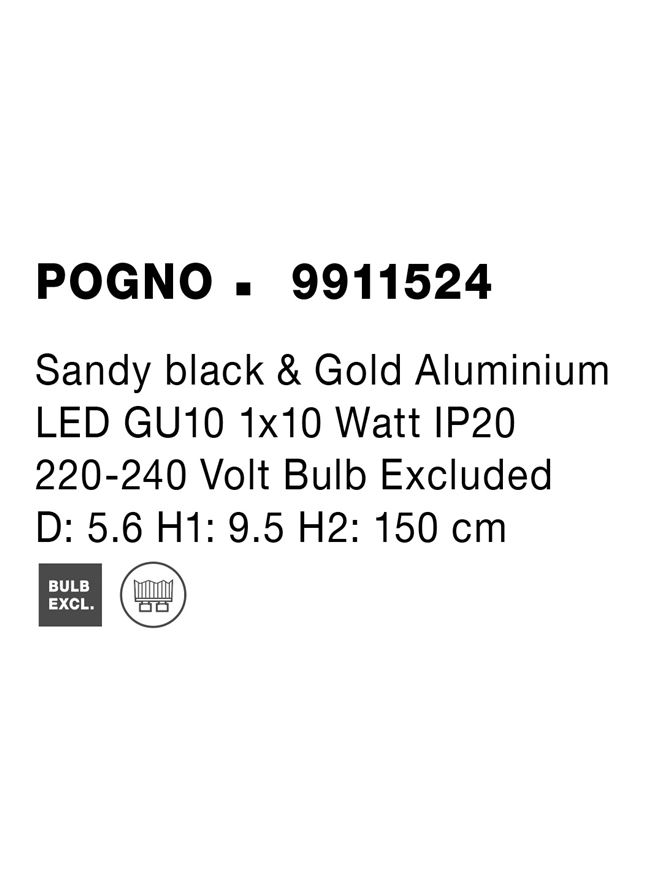 Срок на доставка: ПО ЗАПИТВАНЕ Продуктова информация Материал: Sandy black & Gold Aluminium Тип крушка: LED GU10 1×10 Watt IP20 220-240 Volt Bulb Excluded Код: 9911524 Тип продукт: MODERN PENDANT LUMINAIRES Размери: D: 5.6 H1: 9.5 H2: 150 cm