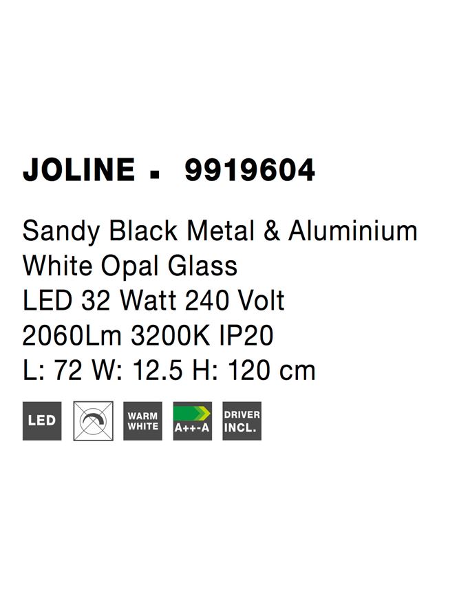 Срок на доставка: ПО ЗАПИТВАНЕ Продуктова информация Материал: Sandy Black Metal & Aluminium White Opal Glass Тип крушка: LED 32W 230V 2060Lm 3200K IP20 Код: 9919604 Тип продукт: NOUVELLE Размери: L: 72 W: 12.5 H: 120 cm