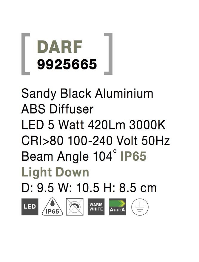Sandy Black Aluminium ABS Diffuser LED 5 Watt 420Lm 3000K 100-240 Volt 50Hz Beam Angle 104o IP65 Light Down D: 9.5 W: 10.5 H: 8.5 cm