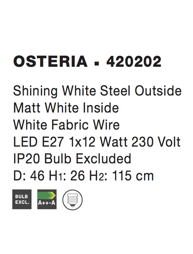 Срок на доставка: ПО ЗАПИТВАНЕ Продуктова информация Материал: Shining White Steel Outside Matt White Inside White Fabric Wire Тип крушка: LED E27 1x12W IP20 Bulb Excluded Код: 420202 Тип продукт: WIRE Размери: D: 46 H1: 26 H2: 115 cm