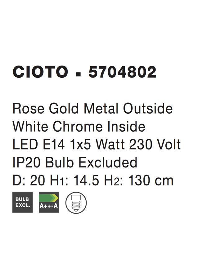 Срок на доставка: ПО ЗАПИТВАНЕ Продуктова информация Материал: Metal Rose Gold Outside White Chrome Inside Тип крушка: LED E14 1x5W IP20 Bulb Excluded Код: 5704802 Тип продукт: LUNAR Размери: D: 20 H1: 14.5 H2: 130 cm