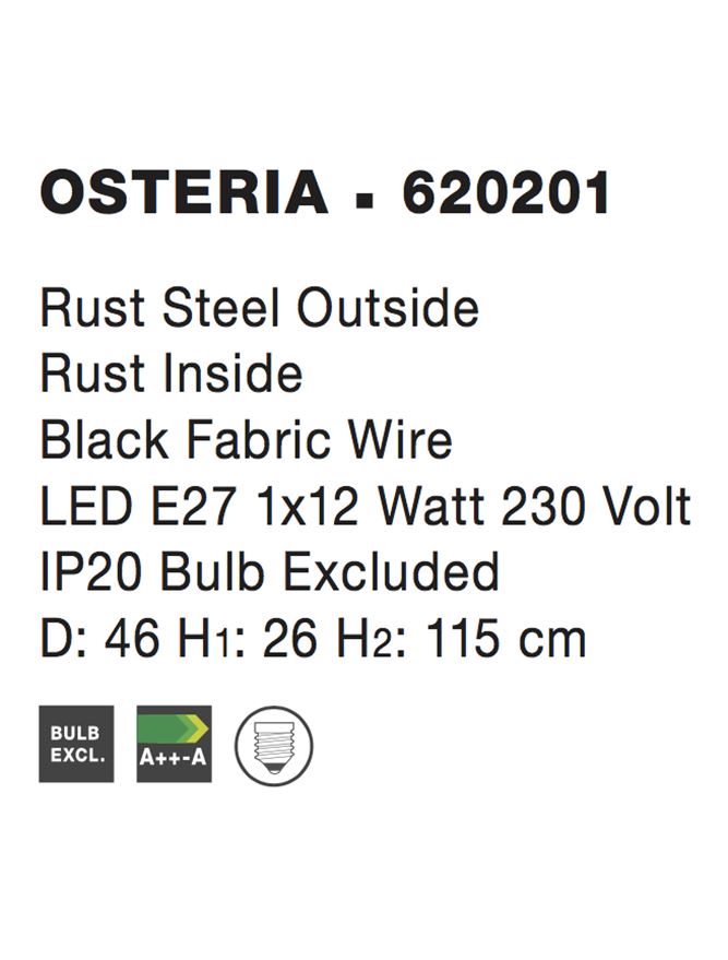 Срок на доставка: ПО ЗАПИТВАНЕ Продуктова информация Материал: Rust Steel Outside Rust Inside Black Fabric Wire Тип крушка: LED E27 1x12W IP20 Bulb Excluded Код: 620201 Тип продукт: WIRE Размери: D: 46 H1: 26 H2: 115 cm