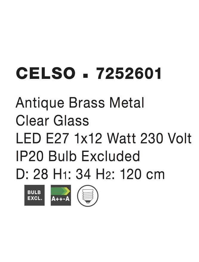 Срок на доставка: ПО ЗАПИТВАНЕ Продуктова информация Материал: Antique Metal Brass Clear Glass Тип крушка: E27 1x60W IP20 Bulb Excluded Код: 7252601 Тип продукт: NOUVELLE Размери: D: 28 H1: 34 H2: 120 cm