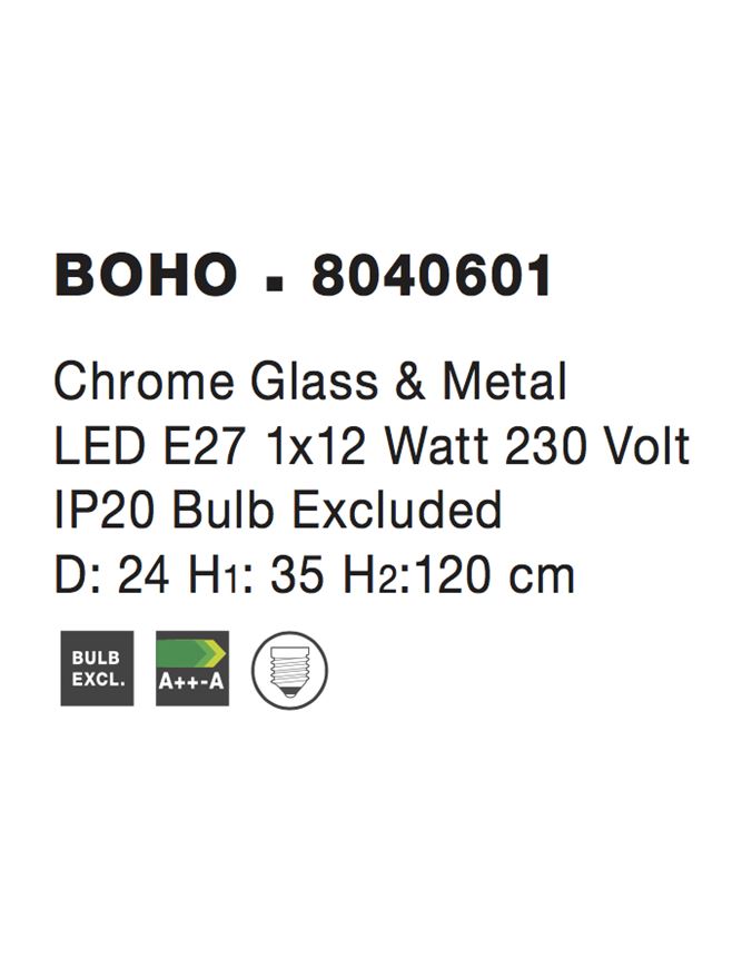 Срок на доставка: ПО ЗАПИТВАНЕ Продуктова информация Материал: Chrome Glass & Metal Тип крушка: LED E27 1×12 Watt 230 Volt IP20 Bulb Excluded Код: 8040601 Тип продукт: VINTAGE Размери: D: 24 H1: 35 H2:120 cm