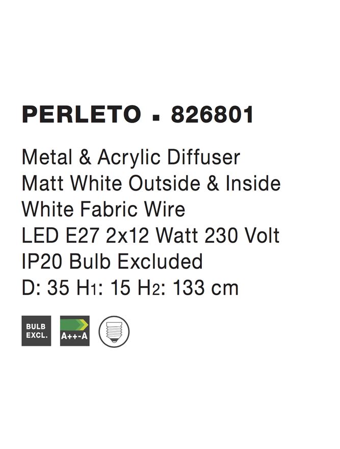 Срок на доставка: ПО ЗАПИТВАНЕ Продуктова информация Материал: Metal & Acrylic Diffuser Matt White Outside & Inside White Fabric Wire Тип крушка: LED E27 2×12 Watt 230 Volt IP20 Bulb Excluded Код: 826801 Тип продукт: HIVE Размери: D: 35 H1: 15 H2: 133 cm