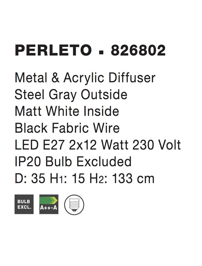 Срок на доставка: ПО ЗАПИТВАНЕ Продуктова информация Материал: Metal & Acrylic Diffuser Steel Gray Outside Matt White Inside Black Fabric Wire Тип крушка: LED E27 2×12 Watt 230 Volt IP20 Bulb Excluded Код: 826802 Тип продукт: HIVE Размери: D: 35 H1: 15 H2: 133 cm