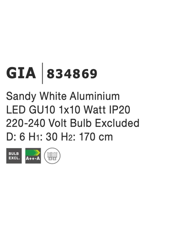 Срок на доставка: ПО ЗАПИТВАНЕ Продуктова информация Материал: White Aluminium Тип крушка: LED GU10 1×10 Watt 230 Volt IP20 Bulb Excluded Код: 834869 Тип продукт: SCANDI Размери: D: 6 H1: 30 H2: 170 cm