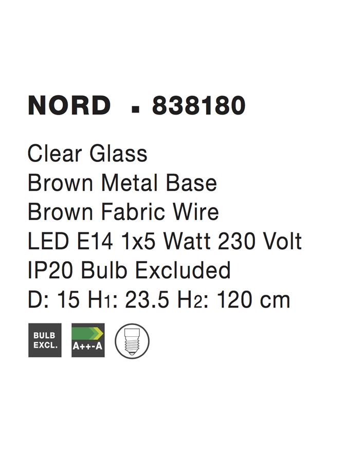 Срок на доставка: ПО ЗАПИТВАНЕ Продуктова информация Материал: Clear Glass-Brown Metal Base-Brown Fabric Wire Тип крушка: LED E14 1×5 Watt 230 Volt IP20 Bulb Excluded Код: 838180 Тип продукт: VINTAGE Размери: D: 15 H: 120 cm
