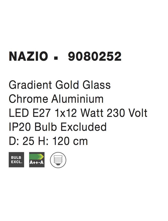 Срок на доставка: ПО ЗАПИТВАНЕ Продуктова информация Материал: Gradient Gold Glass Chrome Aluminium Тип крушка: LED E27 1x12W 230V IP20 Bulb Excluded Код: 9080252 Тип продукт: LUNAR Размери: D: 25 H: 120 cm