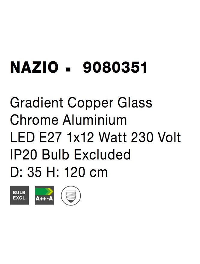 Срок на доставка: ПО ЗАПИТВАНЕ Продуктова информация Материал: Gradient Copper Glass Chrome Aluminium Тип крушка: LED E27 1x12W 230V IP20 Bulb Excluded Код: 9080351 Тип продукт: LUNAR Размери: D: 35 H: 120 cm
