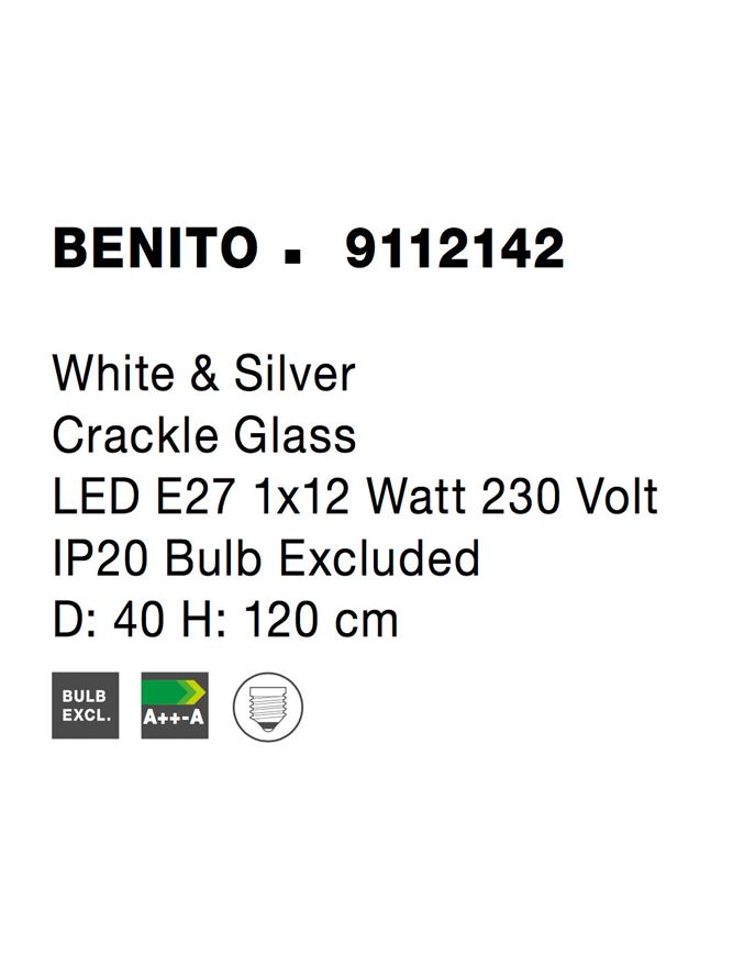 Срок на доставка: ПО ЗАПИТВАНЕ Продуктова информация Материал: White & Silver Crackle Glass Тип крушка: LED E27 1x12W 230V IP20 Bulb Excluded Код: 9112142 Тип продукт: AGNES Размери: D: 40 H: 120 cm
