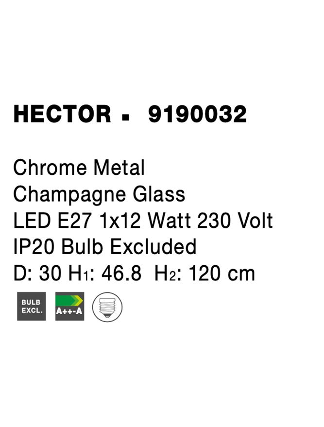 Срок на доставка: ПО ЗАПИТВАНЕ Продуктова информация Материал: Chrome Metal Champagne Glass Тип крушка: LED E27 1×12 Watt 230 Volt IP20 Bulb Excluded Код: 9190032 Тип продукт: VINTAGE Размери: D: 30 H1: 46.8 H2: 120 cm