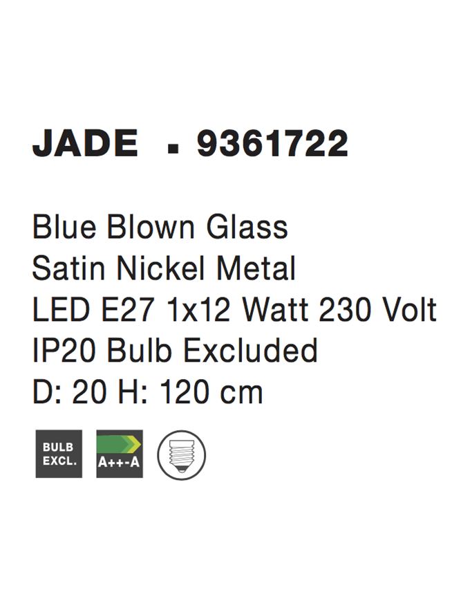 Срок на доставка: ПО ЗАПИТВАНЕ Продуктова информация Материал: Blue Blown Glass Satin Nickel Metal Тип крушка: LED E27 1×12 Watt 230 Volt IP20 Bulb Excluded Код: 9361722 Тип продукт: VINTAGE Размери: D: 30 H: 120 cm
