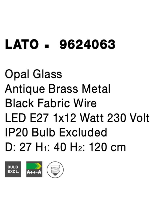 Срок на доставка: ПО ЗАПИТВАНЕ Продуктова информация Материал: Opal Glass Antique Brass Metal Black Fabric Wire Тип крушка: LED E27 1×12 Watt 230 Volt IP20 Bulb Excluded Код: 9624063 Тип продукт: NOUVELLE Размери: D: 27 H1: 40 H2: 120 cm
