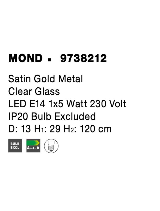 Срок на доставка: ПО ЗАПИТВАНЕ Продуктова информация Материал: Satin Gold Metal Clear Glass Тип крушка: LED E14 1×5 Watt 230 Volt IP20 Код: 9738212 Тип продукт: VINTAGE Размери: D: 13 H: 120 cm