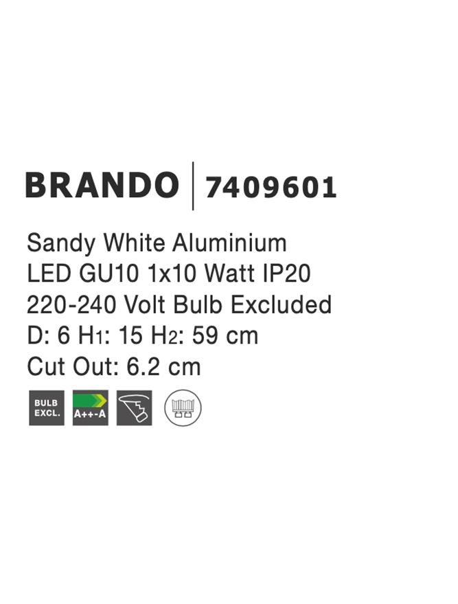Срок на доставка: ПО ЗАПИТВАНЕ Продуктова информация Материал: Sandy White Aluminium Adjustable Тип крушка: GU10 1x35W IP20 Bulb Excluded Код: 7409601 Тип продукт: TECHNICAL LUMINAIRES Размери: D: 6 H1: 15 H2: 59 cm