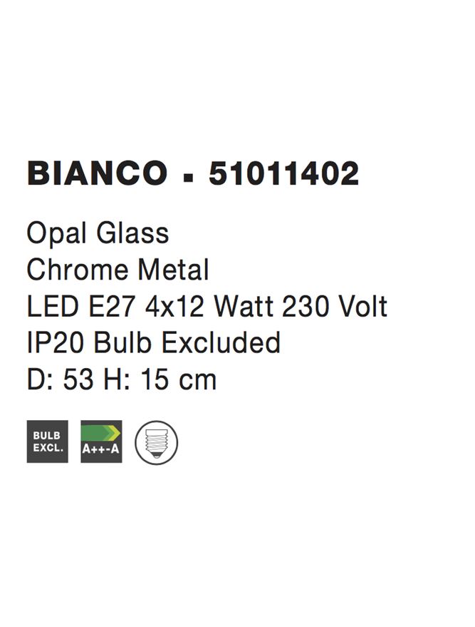Срок на доставка: ПО ЗАПИТВАНЕ Продуктова информация Материал: Opal Glass Chrome Metal Тип крушка: LED E27 4x12W IP20 Bulb Excluded Код: 51011402 Тип продукт: MILKY WHITE Размери: D: 53 H: 15 cm