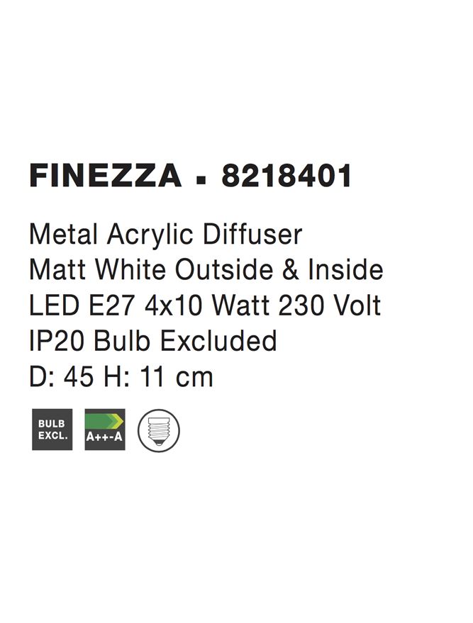Плафон 8218401 e осветително тяло в съвременен стил, което е подходящо за всекидневна / хол, спалня, кухня, трапезария, коридор, антре, стълбище, офис и други помещения в дома. Осветителното тяло е с гарантирано европейско качество, произведено от утвърдена фирма в производството на осветителни тела, като nova-luce (гърция).