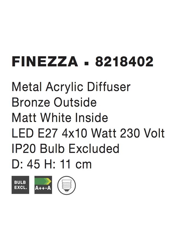 Плафон 8218402 e осветително тяло в съвременен стил, което е подходящо за всекидневна / хол, спалня, кухня, трапезария, коридор, антре, стълбище, офис и други помещения в дома. Осветителното тяло е с гарантирано европейско качество, произведено от утвърдена фирма в производството на осветителни тела, като nova-luce (гърция).