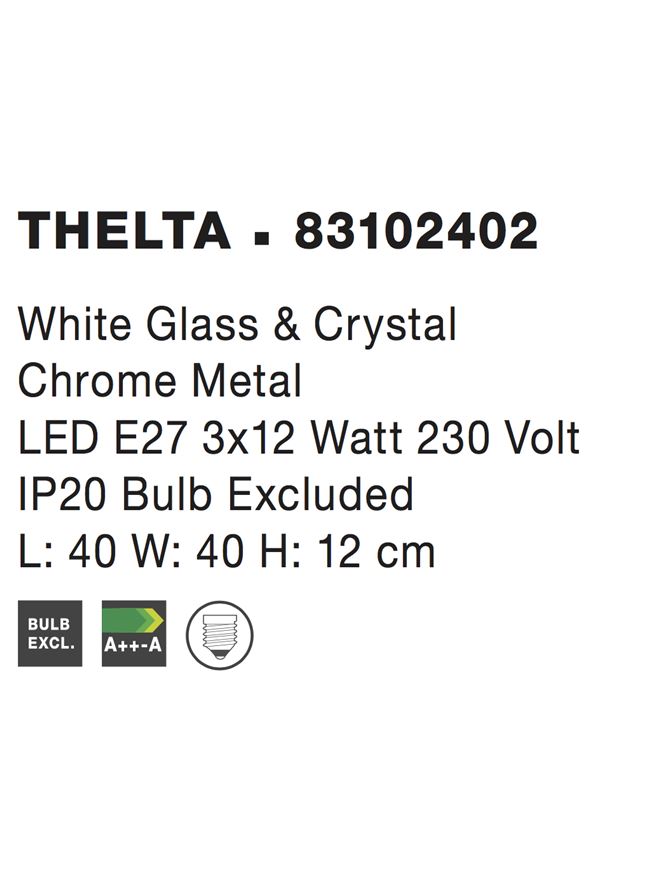 Срок на доставка: ПО ЗАПИТВАНЕ Продуктова информация Материал: White Glass & Crystal Chrome Metal Тип крушка: LED E27 3×12 Watt 230 Volt IP20 Bulb Excluded Код: 83102402 Тип продукт: AGNES Размери: L: 40 W: 40 H: 12 cm