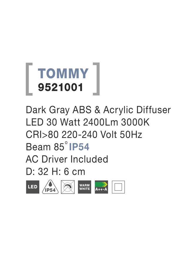 Срок на доставка: ПО ЗАПИТВАНЕ Продуктова информация Материал: Dark Gray ABS & Acrylic Diffuser, Ac Driver Included Тип крушка: LED 30 Watt 2400Lm 3000K, 220-240 Volt 50Hz Beam 85 degrees -IP54- Код: 9521001 Тип продукт: OUTDOOR – CEILING Размери: D: 32 H: 6 cm