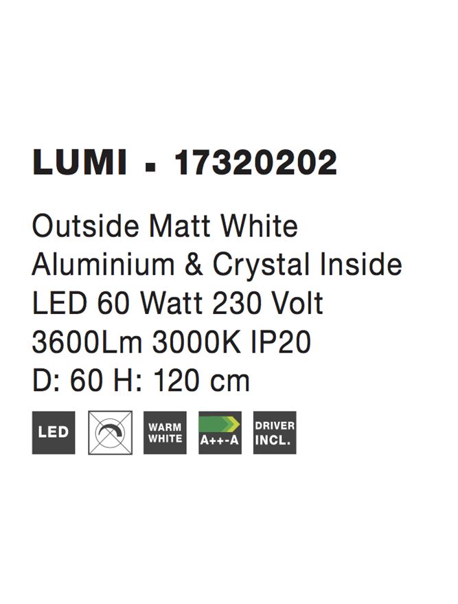 Срок на доставка: ПО ЗАПИТВАНЕ Продуктова информация Материал: Outside Matt White Aluminium & Crystal Inside Тип крушка: LED 60W 3600 Lm 3000K IP20 Код: 17320202 Тип продукт: CRYSTAL Размери: D:60 H:120
