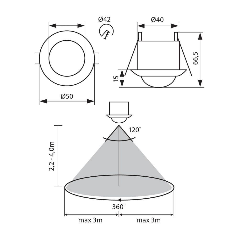 Декларация СерияKYLO Напрежение (V)230V Степен на защитаIP20 Формакръгла форма Размери (mm)Ø50×66.5mm Начин на монтажза вграждане Max натоварванеЛНЖ 800W; LED 400W Цвят на корпусабял Гаранция12 месеца гаранция Тип на сензораИнфрачервен сензор Монтажен отворØ42mm