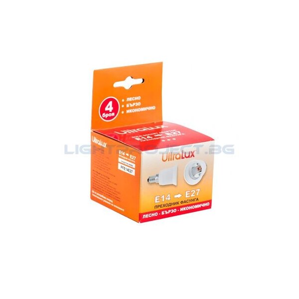 описание: Преходник-фасунга с цокъл – Е14 към Е27; 4 броя в кутия. UL-PFE14E27