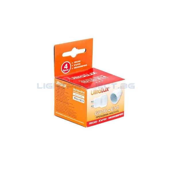 описание: Преходник-фасунга с цокъл – GU10 към Е14; 4 броя в кутия. UL-PFGU10E14