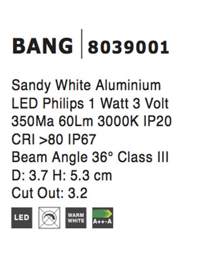 Срок на доставка: ПО ЗАПИТВАНЕ Продуктова информация Материал: White Aluminium Тип крушка: LED 1 Watt 3 Volt 350Ma 60Lm IP67 3000K Код: 8039001 Тип продукт: STEP LIGHTS Размери: D:3.7 H:5.3 cm Cutout: 3.2 cm